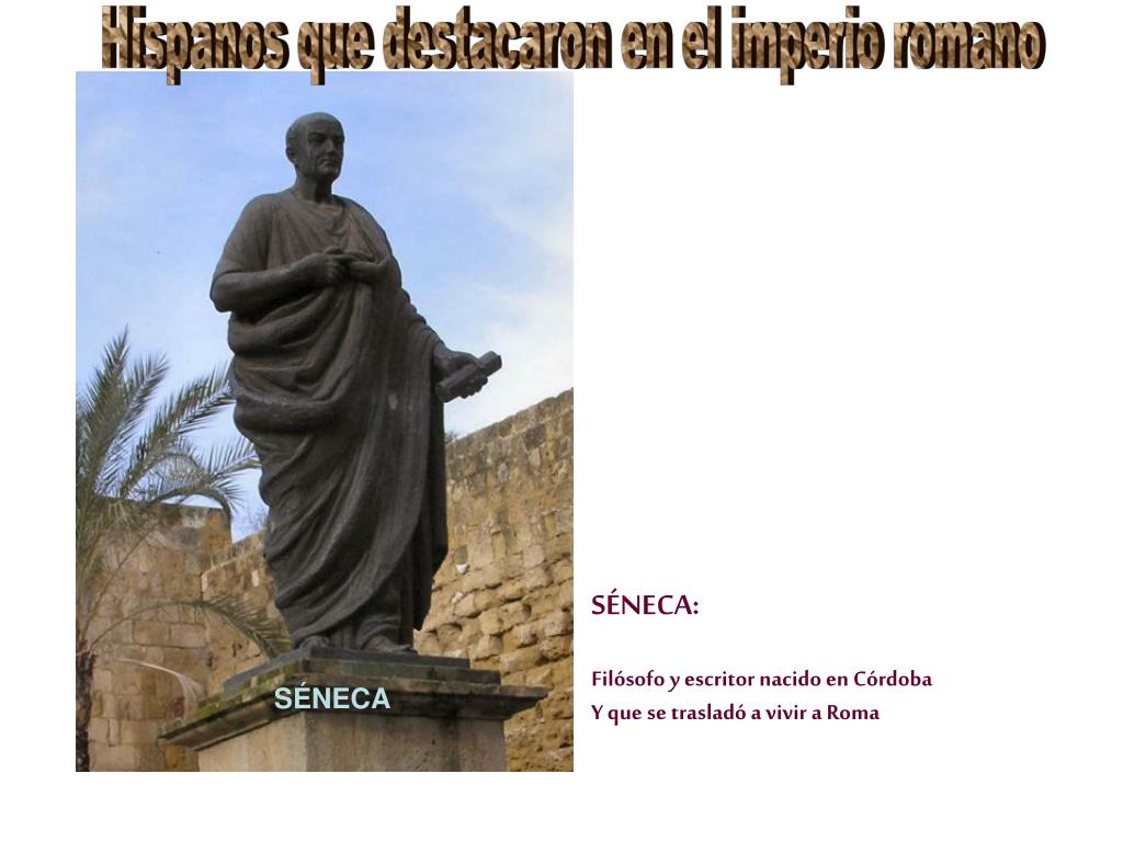 Hispanos que destacaron en el imperio romano SÉNECA: Filósofo y escritor nacido en Córdoba Y que se trasladó a vivir a Roma SÉNECA