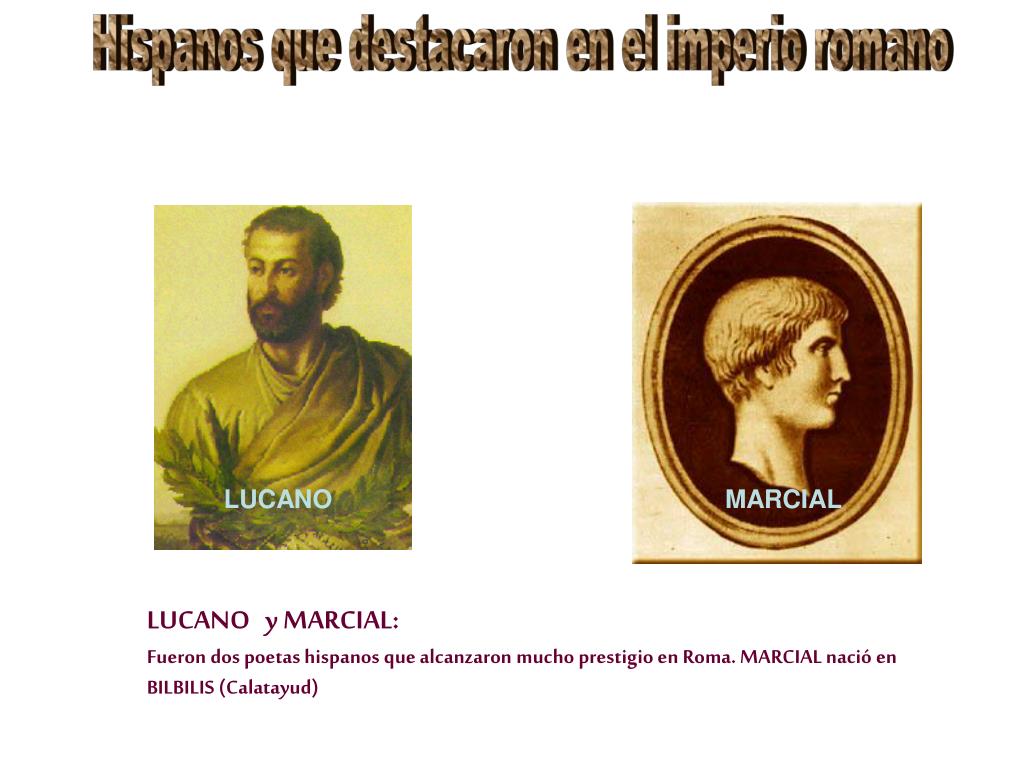 Hispanos que destacaron en el imperio romano LUCANO MARCIAL LUCANO y MARCIAL: Fueron dos poetas hispanos que alcanzaron mucho prestigio en Roma. MARCIAL nació en BILBILIS (Calatayud)