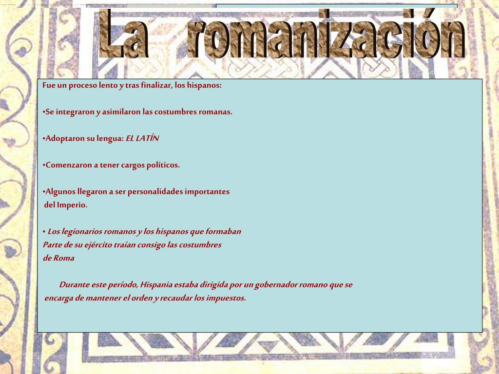 Hace más de 2.000 años los romanos conquistaron la Península tras derrotar a los cartagines. La romanización • Fue un proceso lento y tras finalizar, los hispanos: • Se integraron y asimilaron las costumbres romanas. • Adoptaron su lengua: EL LATÍN • Comenzaron a tener cargos políticos. • Algunos llegaron a ser personalidades importantes • del Imperio. • Los legionarios romanos y los hispanos que formaban • Parte de su ejército traían consigo las costumbres • de Roma • Durante este período, Hispania estaba dirigida por un gobernador romano que se • encarga de mantener el orden y recaudar los impuestos. La llamaron HISPANIA