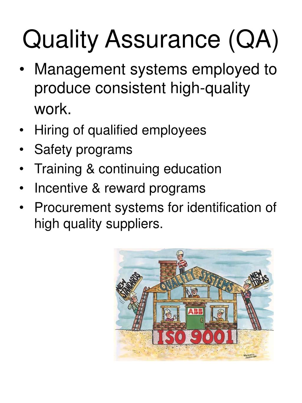 Quality Assurance (QA) • Management systems employed to produce consistent high-quality work. • Hiring of qualified employees • Safety programs • Training & continuing education • Incentive & reward programs • Procurement systems for identification of high quality suppliers.