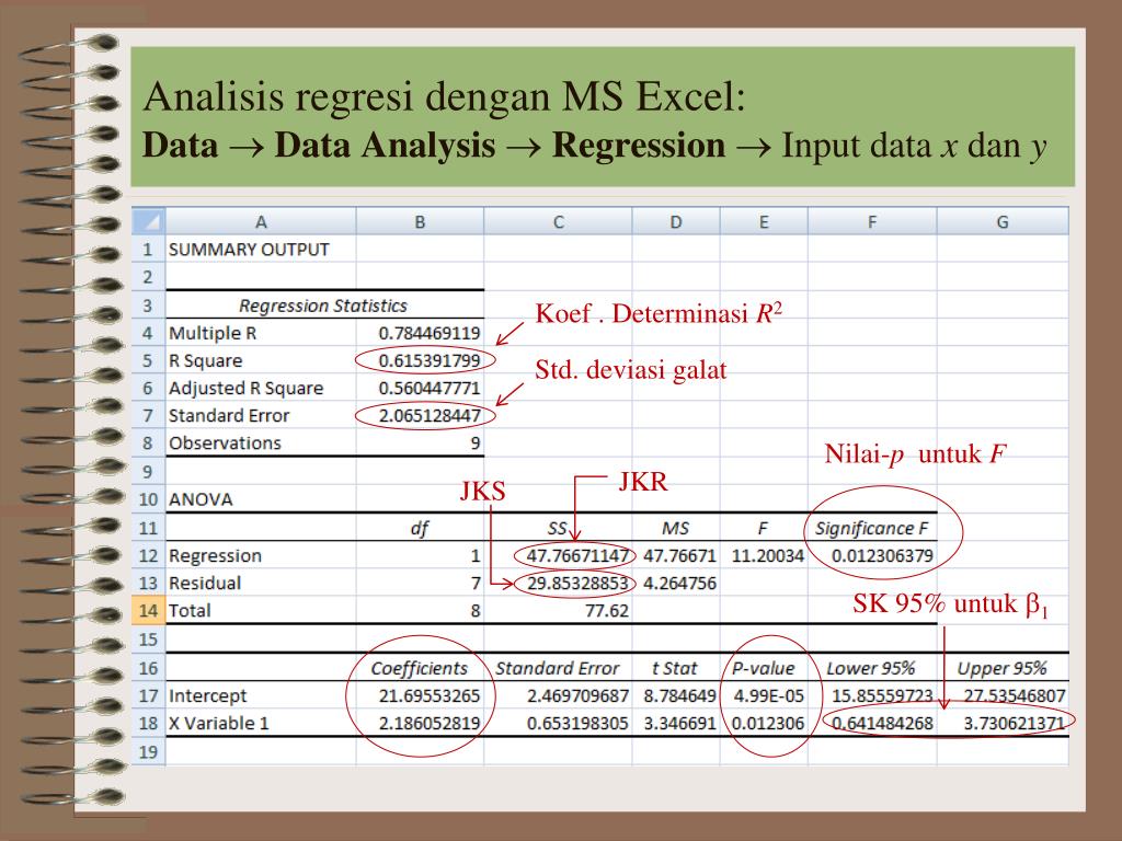 Analisis regresi dengan MS Excel: Data Data Analysis Regression Input data x dan y Koef . Determinasi R2 Std. deviasi galat Nilai-p untuk F JKR JKS SK 95% untuk 1