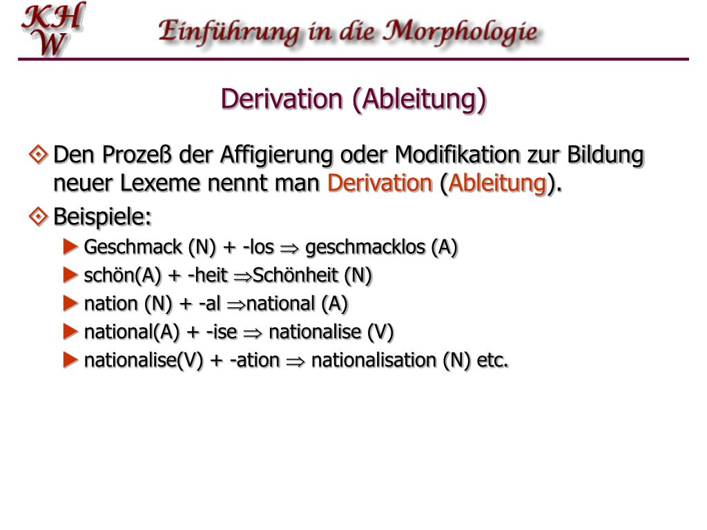 Derivation (Ableitung) • Den Prozeß der Affigierung oder Modifikation zur Bildung neuer Lexeme nennt man Derivation (Ableitung). • Beispiele: • Geschmack (N) + -los geschmacklos (A) • schön(A) + -heit Schönheit (N) • nation (N) + -al national (A) • national(A) + -ise nationalise (V) • nationalise(V) + ‑ation nationalisation (N) etc.