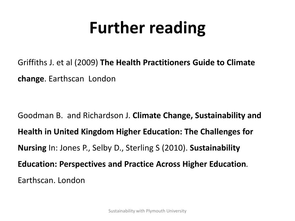 Further reading Griffiths J. et al (2009) The Health Practitioners Guide to Climate change. Earthscan London Goodman B. and Richardson J. Climate Change,Sustainability and Health in United Kingdom Higher Education: The Challenges for Nursing In: Jones P., Selby D., Sterling S (2010).Sustainability Education: Perspectives and Practice Across Higher Education.Earthscan. London Sustainability with Plymouth University
