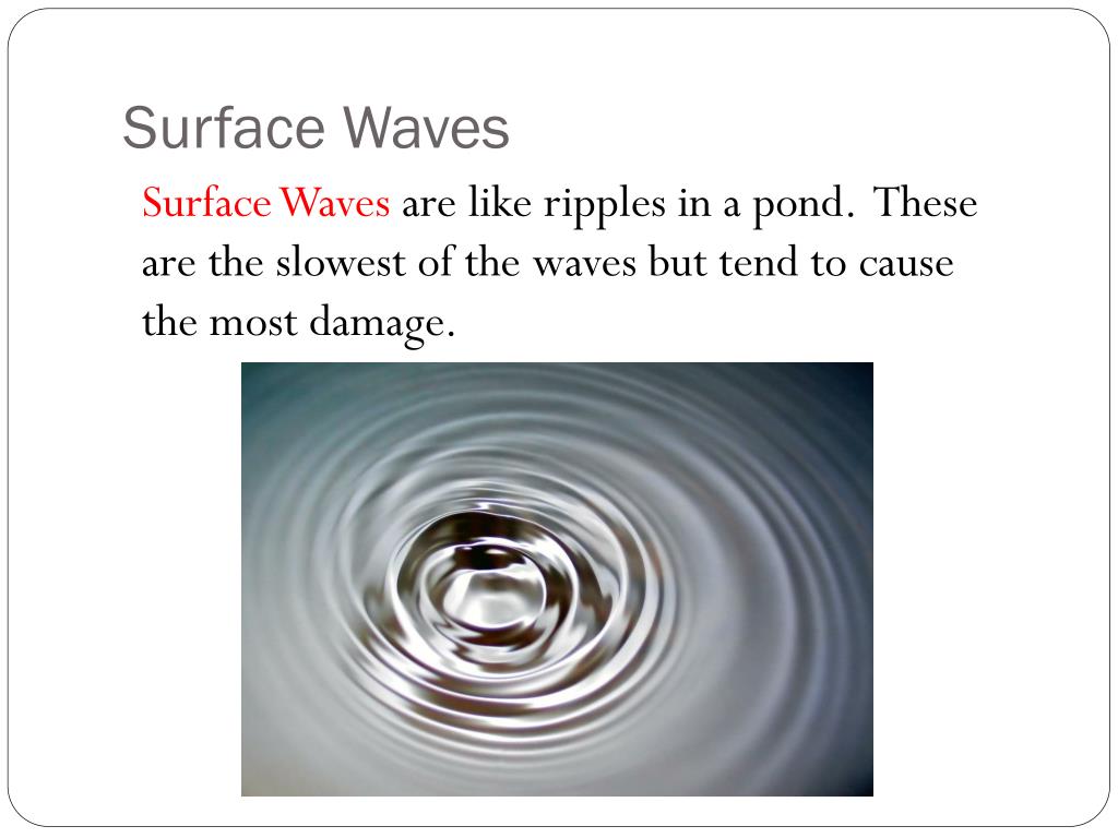 Surface Waves Surface Waves are like ripples in a pond. These are the slowest of the waves but tend to cause the most damage.