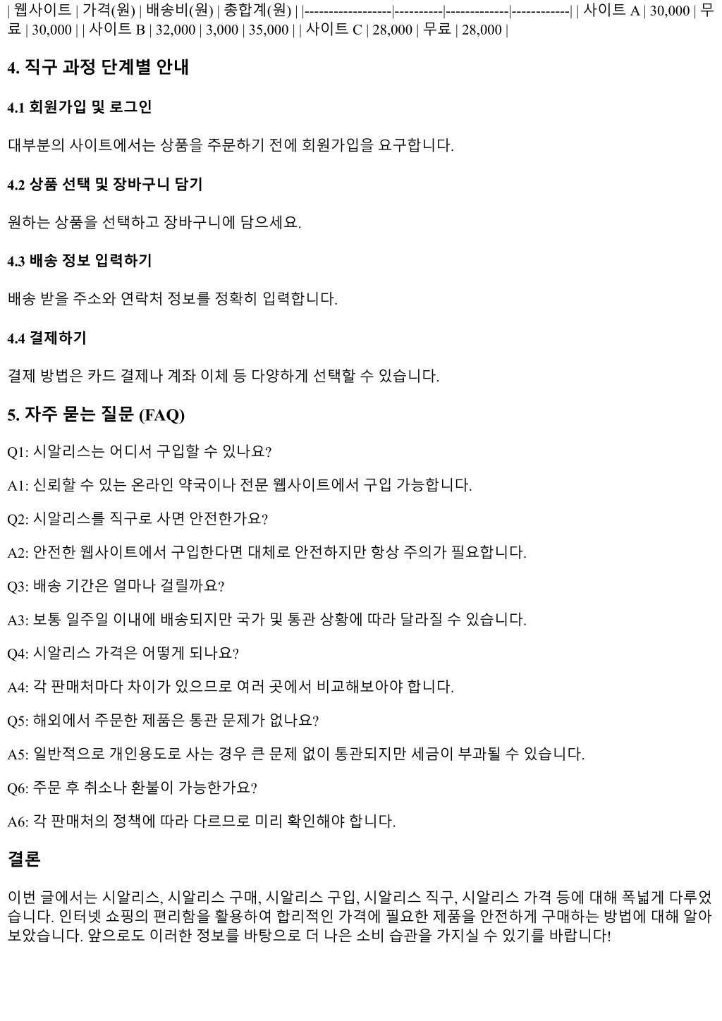 2. | 웹사이트 | 가격(원) | 배송비(원) | 총합계(원) | |------------------|----------|-------------|------------| | 사이트 A | 30,000 | 무 료 | 30,000 | | 사이트 B | 32,000 | 3,000 | 35,000 | | 사이트 C | 28,000 | 무료 | 28,000 | 4. 직구과정단계별안내 4.1 회원가입및로그인 대부분의사이트에서는상품을주문하기전에회원가입을요구합니다. 4.2 상품선택및장바구니담기 원하는상품을선택하고장바구니에담으세요. 4.3 배송정보입력하기 배송받을주소와연락처정보를정확히입력합니다. 4.4 결제하기 결제방법은카드결제나계좌이체등다양하게선택할수있습니다. 5. 자주묻는질문 (FAQ) Q1: 시알리스는어디서구입할수있나요? A1: 신뢰할수있는온라인약국이나전문웹사이트에서구입가능합니다. Q2: 시알리스를직구로사면안전한가요? A2: 안전한웹사이트에서구입한다면대체로안전하지만항상주의가필요합니다. Q3: 배송기간은얼마나걸릴까요? A3: 보통일주일이내에배송되지만국가및통관상황에따라달라질수있습니다. Q4: 시알리스가격은어떻게되나요? A4: 각판매처마다차이가있으므로여러곳에서비교해보아야합니다. Q5: 해외에서주문한제품은통관문제가없나요? A5: 일반적으로개인용도로사는경우큰문제없이통관되지만세금이부과될수있습니다. Q6: 주문후취소나환불이가능한가요? A6: 각판매처의정책에따라다르므로미리확인해야합니다. 결론 이번글에서는시알리스, 시알리스구매, 시알리스구입, 시알리스직구, 시알리스가격등에대해폭넓게다루었 습니다. 인터넷쇼핑의편리함을활용하여합리적인가격에필요한제품을안전하게구매하는방법에대해알아 보았습니다. 앞으로도이러한정보를바탕으로더나은소비습관을가지실수있기를바랍니다!