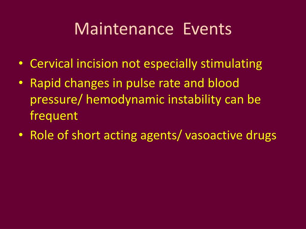 Maintenance Events • Cervical incision not especially stimulating • Rapid changes in pulse rate and blood pressure/ hemodynamic instability can be frequent • Role of short acting agents/ vasoactive drugs