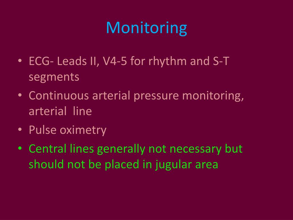 Monitoring • ECG- Leads II, V4-5 for rhythm and S-T segments • Continuous arterial pressure monitoring, arterial line • Pulse oximetry • Central lines generally not necessary but should not be placed in jugular area