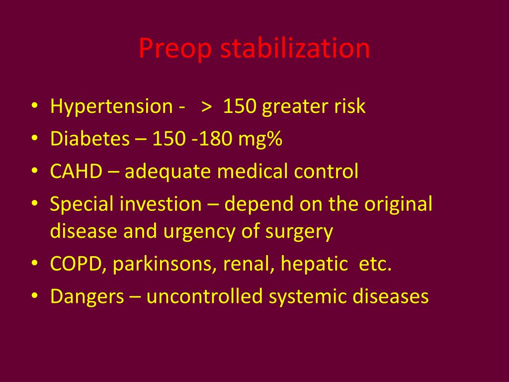 Preop stabilization • Hypertension - > 150 greater risk • Diabetes – 150 -180 mg% • CAHD – adequate medical control • Special investion – depend on the original disease and urgency of surgery • COPD, parkinsons, renal, hepatic etc. • Dangers – uncontrolled systemic diseases