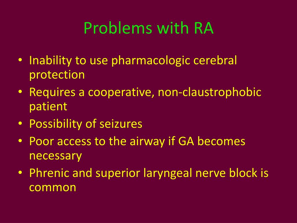 Problems with RA • Inability to use pharmacologic cerebral protection • Requires a cooperative, non-claustrophobic patient • Possibility of seizures • Poor access to the airway if GA becomes necessary • Phrenic and superior laryngeal nerve block is common