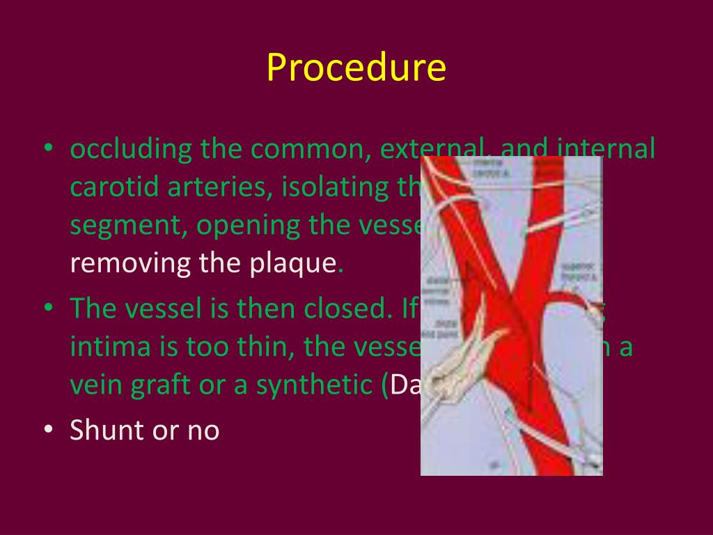 Procedure • occluding the common, external, and internal carotid arteries, isolating the diseased segment, opening the vessel wall, and removing the plaque. • The vessel is then closed. If the remaining intima is too thin, the vessel is closed with a vein graft or a synthetic (Dacron) patch. • Shunt or no