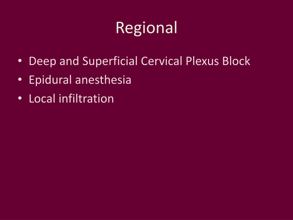 Regional • Deep and Superficial Cervical Plexus Block • Epidural anesthesia • Local infiltration