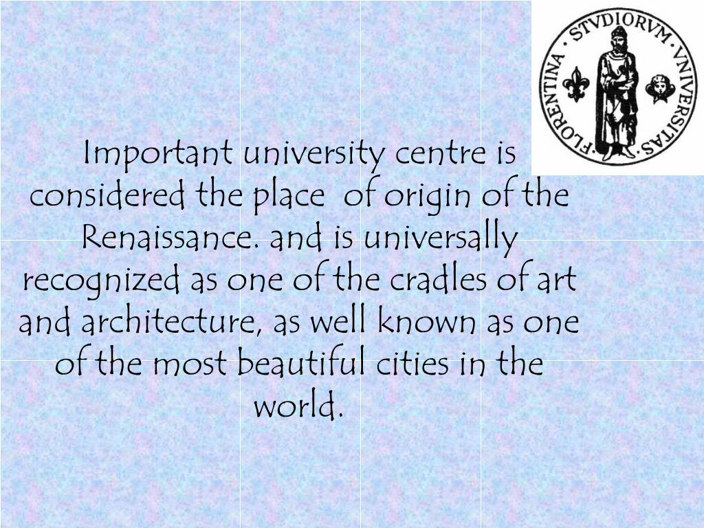 Important university centre is considered the place of origin of the Renaissance. and is universally recognized as one of the cradles of art and architecture, as well known as one of the most beautiful cities in the world.