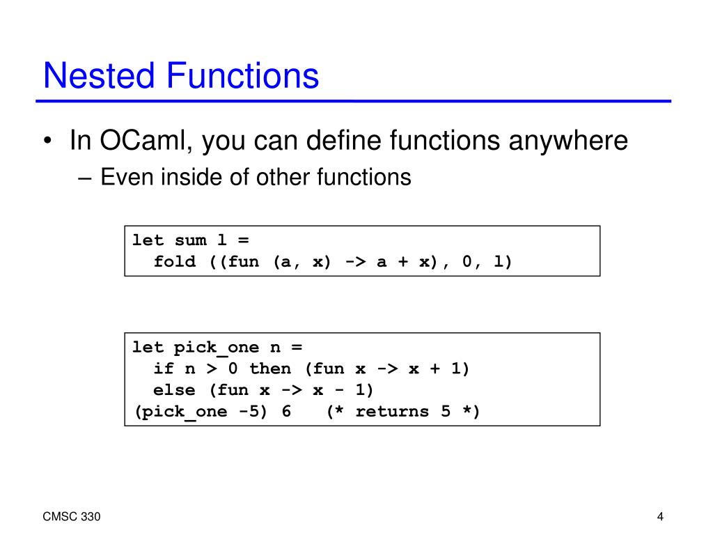 CMSC 330 Nested Functions In OCaml, you can define functions anywhere Even inside of other functions let sum l = fold ((fun (a, x) -> a + x), 0, l) let pick_one n = if n > 0 then (fun x -> x + 1) else (fun x -> x - 1) (pick_one -5) 6 (* returns 5 *)