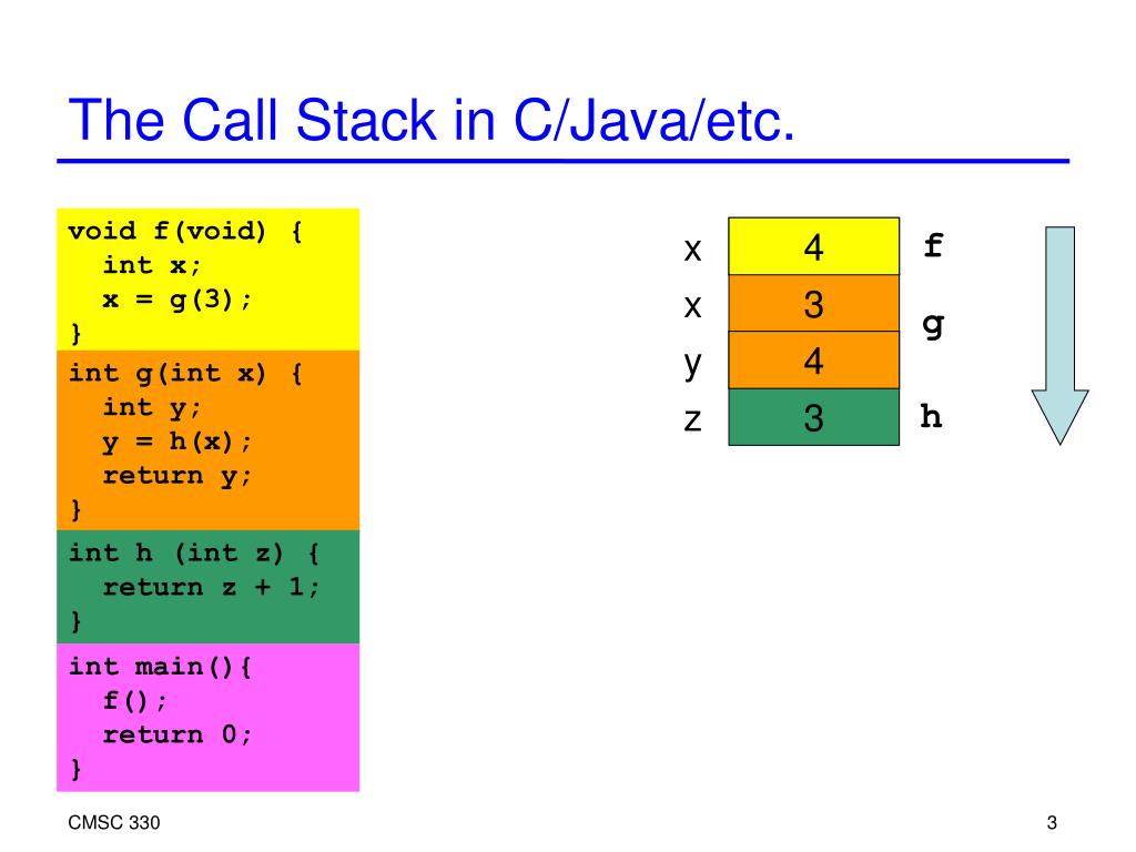 CMSC 330 The Call Stack in C/Java/etc. void f(void) { int x; x = g(3); } x <junk> 4 f x 3 g y 4 <junk> int g(int x) { int y; y = h(x); return y; } z 3 h int h (int z) { return z + 1; } int main(){ f(); return 0; }