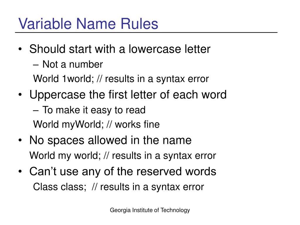 Variable Name Rules • Should start with a lowercase letter • Not a number World 1world; // results in a syntax error • Uppercase the first letter of each word • To make it easy to read World myWorld; // works fine • No spaces allowed in the name World my world; // results in a syntax error • Can’t use any of the reserved words Class class; // results in a syntax error Georgia Institute of Technology