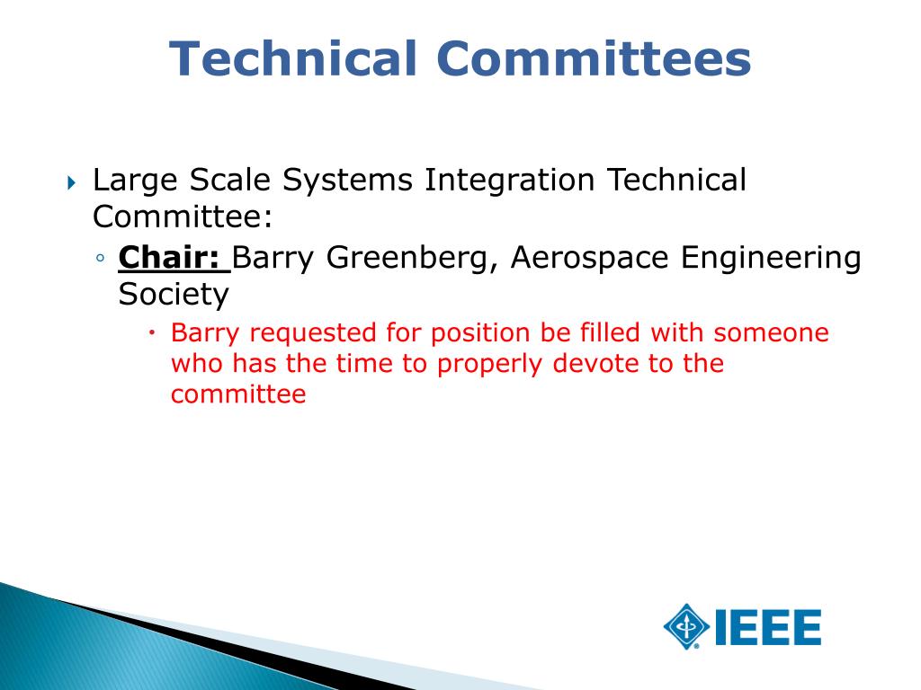 Technical Committees • Large Scale Systems Integration Technical Committee: • Chair: Barry Greenberg, Aerospace Engineering Society • Barry requested for position be filled with someone who has the time to properly devote to the committee
