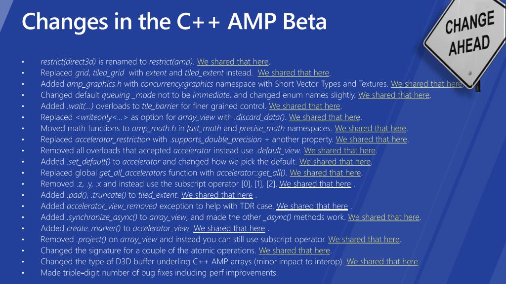 Changes in the C++ AMP Beta • restrict(direct3d) is renamed to restrict(amp). We shared that here. • Replaced grid, tiled_grid with extent and tiled_extent instead. We shared that here. • Added amp_graphics.h with concurrency:graphics namespace with Short Vector Types and Textures. We shared that here. • Changed default queuing _mode not to be immediate, and changed enum names slightly. We shared that here. • Added .wait(…) overloads to tile_barrier for finer grained control. We shared that here. • Replaced <writeonly<…> as option for array_view with .discard_data(). We shared that here. • Moved math functions to amp_math.h in fast_math and precise_math namespaces. We shared that here. • Replaced accelerator_restriction with .supports_double_precision + another property. We shared that here. • Removed all overloads that accepted accelerator instead use .default_view. We shared that here. • Added .set_default() to accelerator and changed how we pick the default. We shared that here. • Replaced global get_all_accelerators function with accelerator::get_all(). We shared that here. • Removed .z, .y, .x and instead use the subscript operator [0], [1], [2]. We shared that here . • Added .pad(), .truncate() to tiled_extent. We shared that here . • Added accelerator_view_removed exception to help with TDR case. We shared that here . • Added .synchronize_async() to array_view, and made the other _async() methods work. We shared that here. • Added create_marker() to accelerator_view. We shared that here . • Removed .project() on array_view and instead you can still use subscript operator. We shared that here. • Changed the signature for a couple of the atomic operations. We shared that here. • Changed the type of D3D buffer underling C++ AMP arrays (minor impact to interop). We shared that here. • Made triple-digit number of bug fixes including perf improvements.