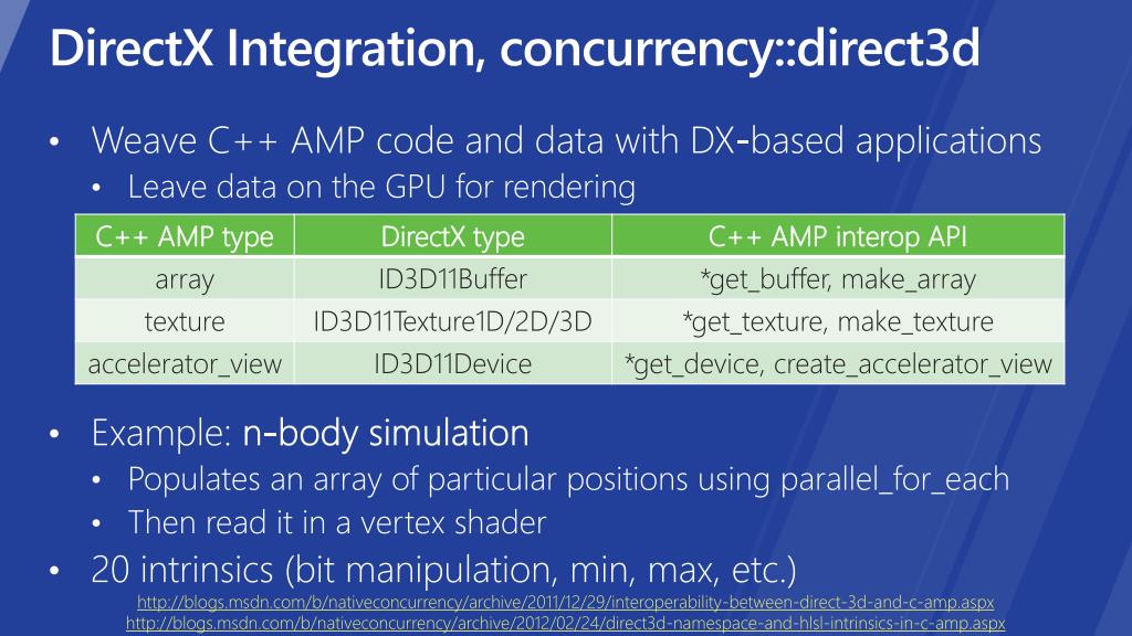 <amp_graphics.h>, concurrency::graphics • norm/unorm scalar type • Short vector types (int_3, float_4, norm_2, etc.) • Swizzle expressions: myvec.yzx = int_3(1, 2, 3); • Textures – efficient access to 1d, 2d, 3d data • Element type is scalar or SVT of rank 1, 2 or 4 • DX limitations apply • Different encodings supported • Interop with DX texture resources http://blogs.msdn.com/b/nativeconcurrency/archive/2012/01/25/concurrency-graphics-in-c-amp.aspx