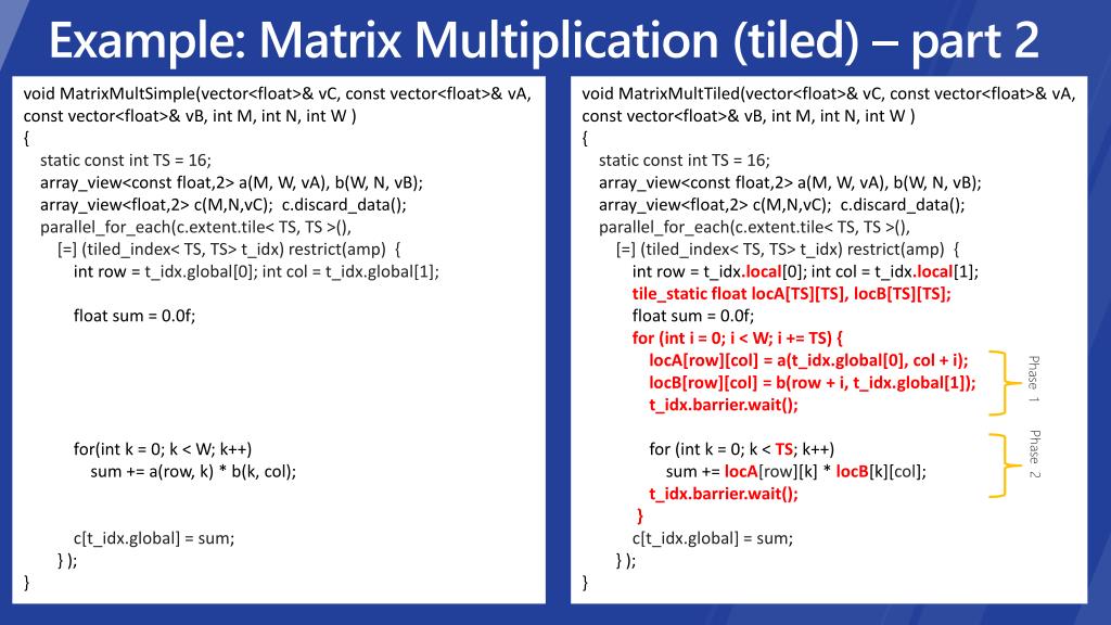 Example: Matrix Multiplication (tiled) – part 1 void MatrixMultSimple(vector<float>& vC, const vector<float>& vA, const vector<float>& vB, int M, int N, int W ) { array_view<const float,2> a(M, W, vA), b(W, N, vB); array_view<float,2> c(M,N,vC); c.discard_data(); parallel_for_each(c.extent, [=] (index<2> idx) restrict(amp) { int row = idx[0]; int col = idx[1]; float sum = 0.0f; for(int k = 0; k < W; k++) sum += a(row, k) * b(k, col); c[idx] = sum; } ); } void MatrixMultTiled(vector<float>& vC, const vector<float>& vA, const vector<float>& vB, int M, int N, int W ) { static const int TS = 16; array_view<const float,2> a(M, W, vA), b(W, N, vB); array_view<float,2> c(M,N,vC); c.discard_data(); parallel_for_each(c.extent.tile< TS, TS >(), [=] (tiled_index< TS, TS> t_idx) restrict(amp) { int row = t_idx.global[0]; int col = t_idx.global[1]; float sum = 0.0f; for(int k = 0; k < W; k++) sum += a(row, k) * b(k, col); c[t_idx.global] = sum; } ); }