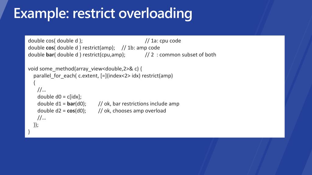 Example: restrict overloading double cos( double d ); // 1a: cpu code double cos( double d ) restrict(amp); // 1b: amp code double bar( double d ) restrict(cpu,amp); // 2 : common subset of both void some_method(array_view<double,2>& c) { parallel_for_each( c.extent, [=](index<2> idx) restrict(amp) { //… double d0 = c[idx]; double d1 = bar(d0);// ok, bar restrictions include amp double d2 = cos(d0);// ok, chooses amp overload //… }); }