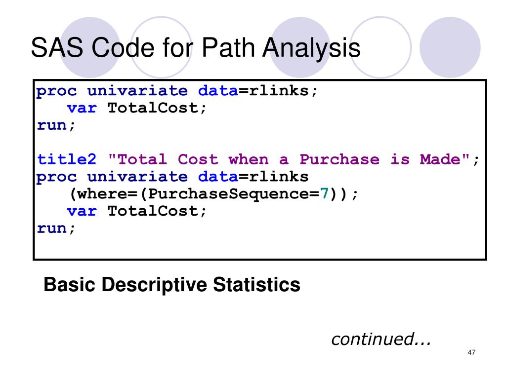 SAS Code for Path Analysis procunivariatedata=rlinks; var TotalCost; run; title2"Total Cost when a Purchase is Made"; procunivariatedata=rlinks (where=(PurchaseSequence=7)); var TotalCost; run; Basic Descriptive Statistics continued...