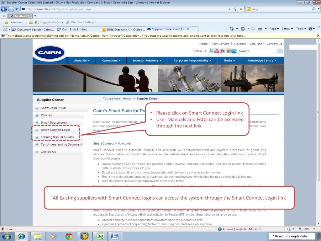 Suppliers can access the Supplier Corner section on Cairn India Website to access all relevant information around working with Cairn Click on Supplier Corner Tab * Based on sample data