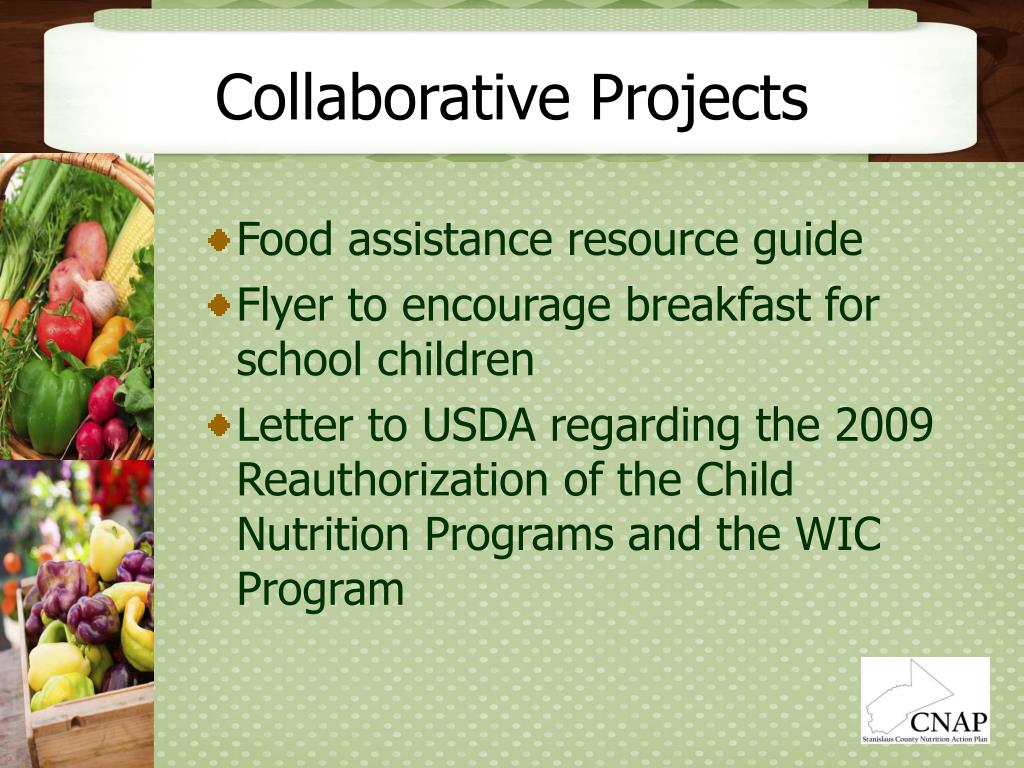 Collaborative Projects • Food assistance resource guide • Flyer to encourage breakfast for school children • Letter to USDA regarding the 2009 Reauthorization of the Child Nutrition Programs and the WIC Program