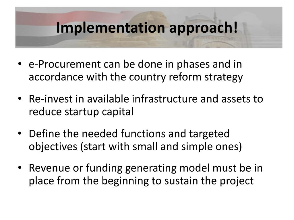 Implementation approach! • e-Procurement can be done in phases and in accordance with the country reform strategy • Re-invest in available infrastructure and assets to reduce startup capital • Define the needed functions and targeted objectives (start with small and simple ones) • Revenue or funding generating model must be in place from the beginning to sustain the project