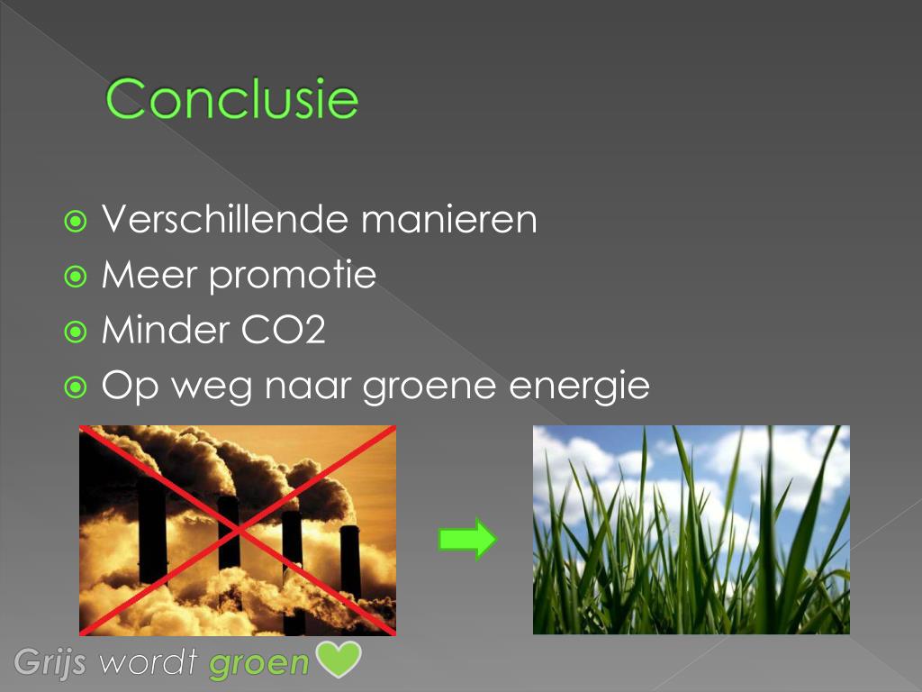 Conclusie • Verschillende manieren • Meer promotie • Minder CO2 • Op weg naar groene energie Grijs wordt groen