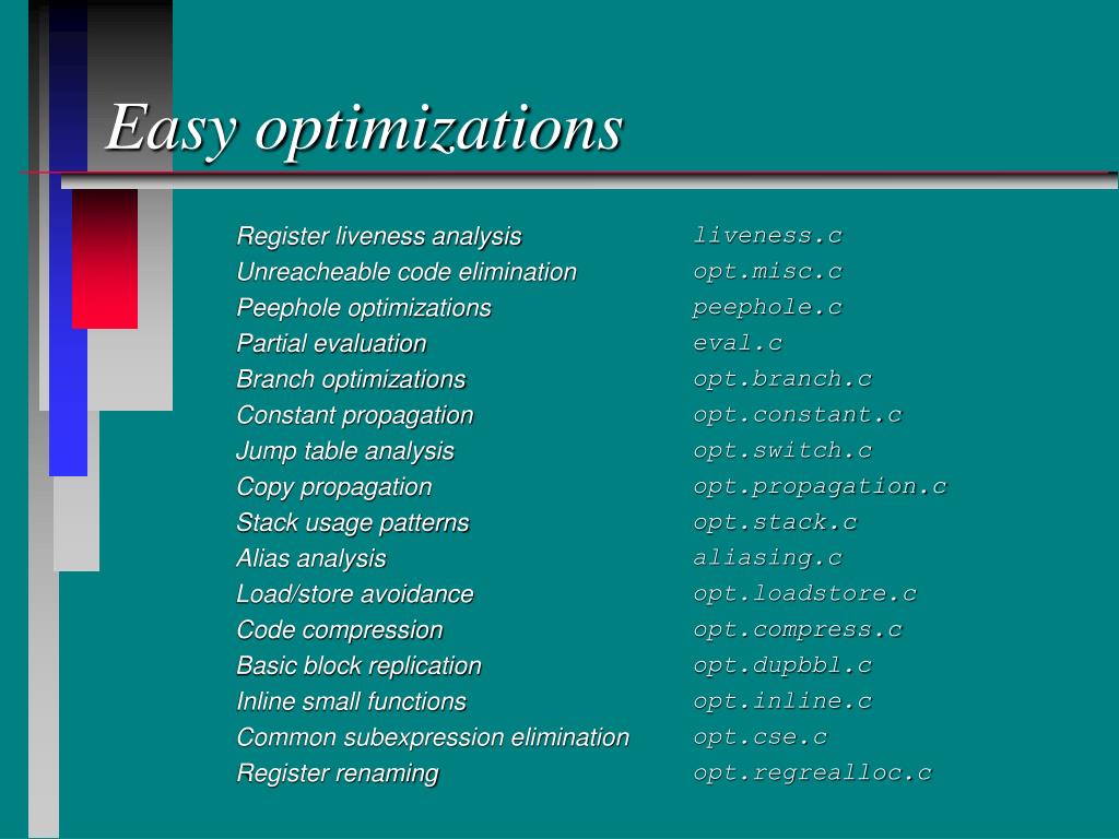 Register liveness analysis Unreacheable code elimination Peephole optimizations Partial evaluation Branch optimizations Constant propagation Jump table analysis Copy propagation Stack usage patterns Alias analysis Load/store avoidance Code compression Basic block replication Inline small functions Common subexpression elimination Register renaming Easy optimizations liveness.c opt.misc.c peephole.c eval.c opt.branch.c opt.constant.c opt.switch.c opt.propagation.c opt.stack.c aliasing.c opt.loadstore.c opt.compress.c opt.dupbbl.c opt.inline.c opt.cse.c opt.regrealloc.c