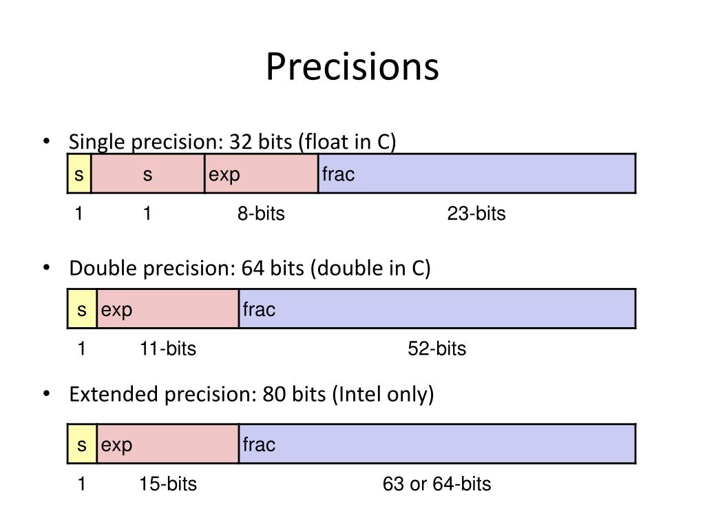 Carnegie Mellon Precisions • Single precision: 32 bits (float in C) • Double precision: 64 bits (double in C) • Extended precision: 80 bits (Intel only)