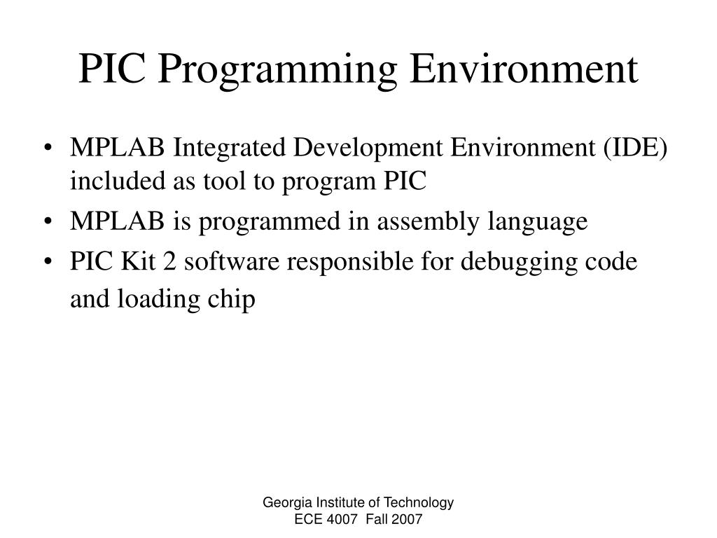 PIC Programming Environment • MPLAB Integrated Development Environment (IDE) included as tool to program PIC • MPLAB is programmed in assembly language • PIC Kit 2 software responsible for debugging code and loading chip Georgia Institute of Technology ECE 4007 Fall 2007