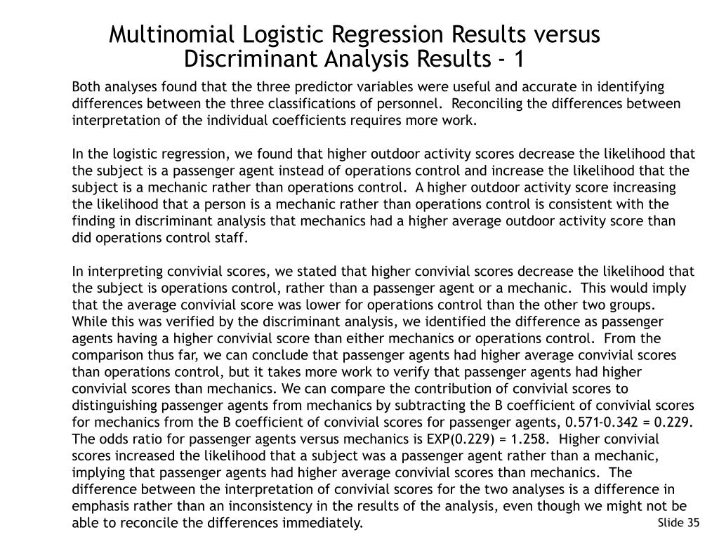 Multinomial Logistic Regression Results versus Discriminant Analysis Results- 1 Both analyses found that the three predictor variables were useful and accurate in identifying differences between the three classifications of personnel. Reconciling the differences between interpretation of the individual coefficients requires more work. In the logistic regression, we found that higher outdoor activity scores decrease the likelihood that the subject is a passenger agent instead of operations control and increase the likelihood that the subject is a mechanic rather than operations control. A higher outdoor activity score increasing the likelihood that a person is a mechanic rather than operations control is consistent with the finding in discriminant analysis that mechanics had a higher average outdoor activity score than did operations control staff. In interpreting convivial scores, we stated that higher convivial scores decrease the likelihood that the subject is operations control, rather than a passenger agent or a mechanic. This would imply that the average convivial score was lower for operations control than the other two groups. While this was verified by the discriminant analysis, we identified the difference as passenger agents having a higher convivial score than either mechanics or operations control. From the comparison thus far, we can conclude that passenger agents had higher average convivial scores than operations control, but it takes more work to verify that passenger agents had higher convivial scores than mechanics. We can compare the contribution of convivial scores to distinguishing passenger agents from mechanics by subtracting the B coefficient of convivial scores for mechanics from the B coefficient of convivial scores for passenger agents, 0.571-0.342 = 0.229. The odds ratio for passenger agents versus mechanics is EXP(0.229) = 1.258. Higher convivial scores increased the likelihood that a subject was a passenger agent rather than a mechanic, implying that passenger agents had higher average convivial scores than mechanics. The difference between the interpretation of convivial scores for the two analyses is a difference in emphasis rather than an inconsistency in the results of the analysis, even though we might not be able to reconcile the differences immediately.