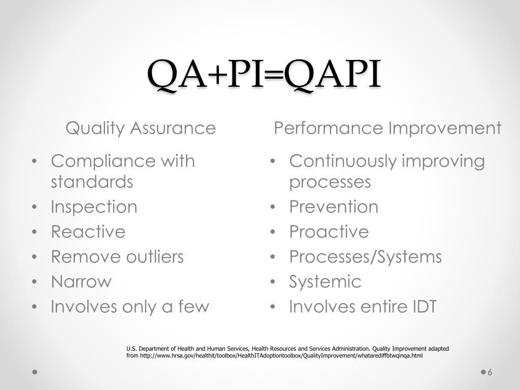 QA+PI=QAPI Quality Assurance Performance Improvement Continuously improving processes Prevention Proactive Processes/Systems Systemic Involves entire IDT U.S. Department of Health and Human Services, Health Resources and Services Administration. Quality Improvement adapted from http://www.hrsa.gov/healthit/toolbox/HealthITAdoptiontoolbox/QualityImprovement/whatarediffbtwqinqa.html Compliance with standards Inspection Reactive Remove outliers Narrow Involves only a few