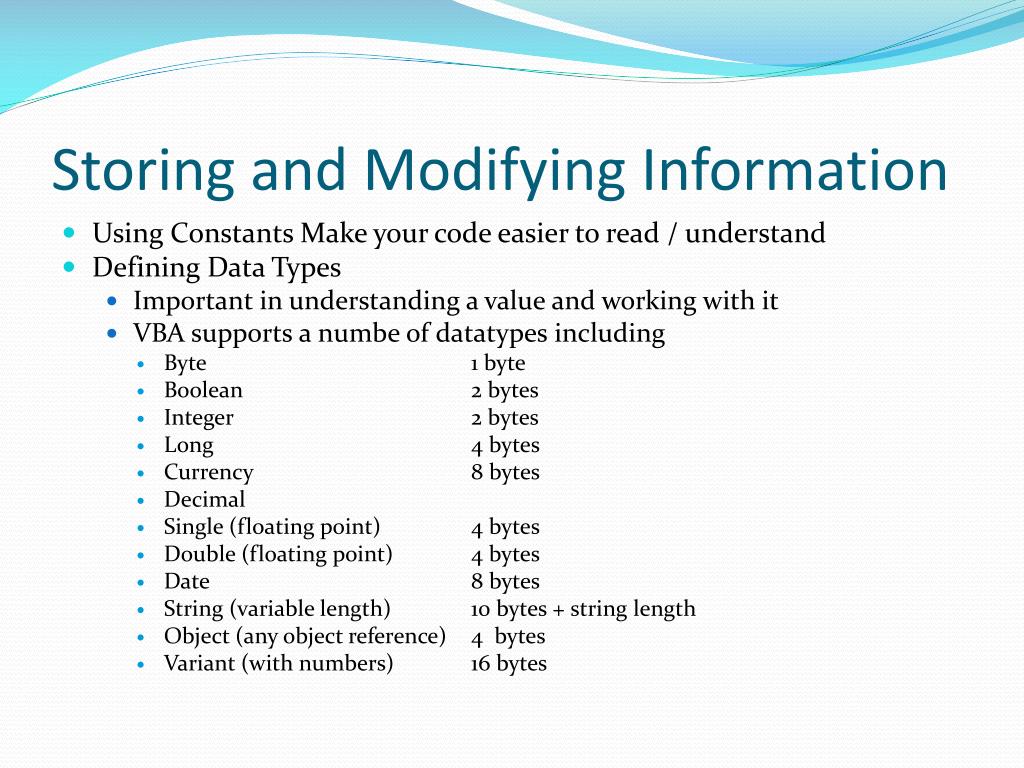 Storing and Modifying Information • Using Constants Make your code easier to read / understand • Defining Data Types • Important in understanding a value and working with it • VBA supports a numbe of datatypes including • Byte 1 byte • Boolean 2 bytes • Integer 2 bytes • Long 4 bytes • Currency 8 bytes • Decimal • Single (floating point) 4 bytes • Double (floating point) 4 bytes • Date 8 bytes • String (variable length) 10 bytes + string length • Object (any object reference) 4 bytes • Variant (with numbers) 16 bytes