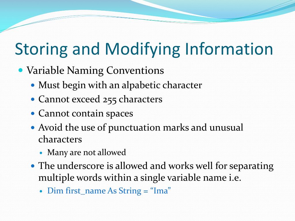 Storing and Modifying Information • Variable Naming Conventions • Must begin with an alpabetic character • Cannot exceed 255 characters • Cannot contain spaces • Avoid the use of punctuation marks and unusual characters • Many are not allowed • The underscore is allowed and works well for separating multiple words within a single variable name i.e. • Dim first_name As String = “Ima”