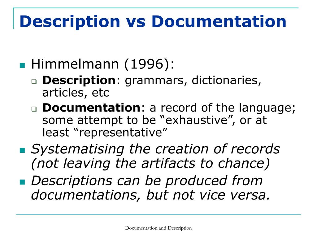 Description vs Documentation • Himmelmann (1996): • Description: grammars, dictionaries, articles, etc • Documentation: a record of the language; some attempt to be “exhaustive”, or at least “representative” • Systematising the creation of records (not leaving the artifacts to chance) • Descriptions can be produced from documentations, but not vice versa. Documentation and Description