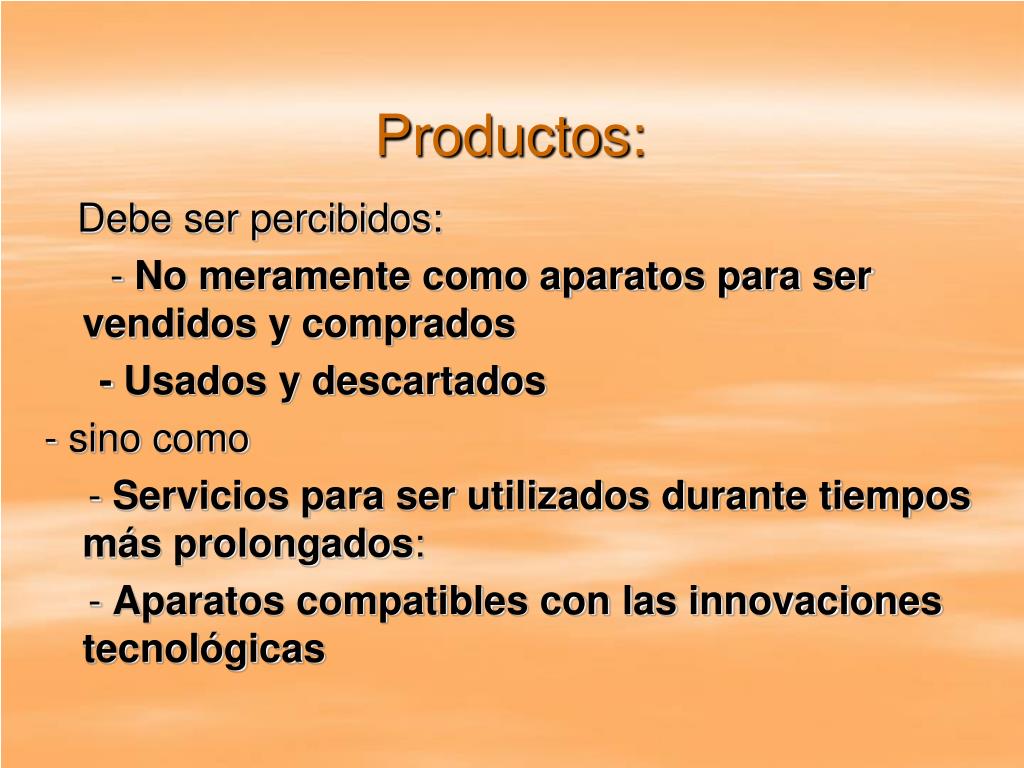 Productos: Debe ser percibidos: - No meramente como aparatos para ser vendidos y comprados - Usados y descartados - sino como - Servicios para ser utilizados durante tiempos más prolongados: - Aparatos compatibles con las innovaciones tecnológicas