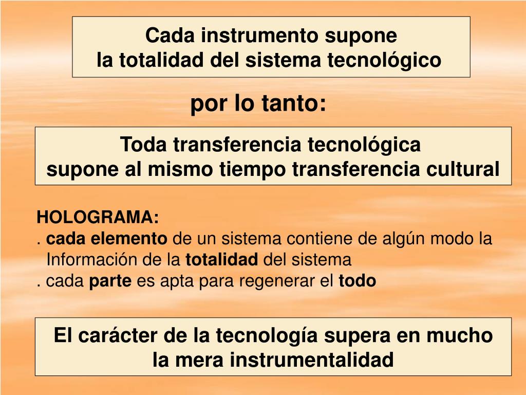 Cada instrumento supone la totalidad del sistema tecnológico por lo tanto: Toda transferencia tecnológica supone al mismo tiempo transferencia cultural HOLOGRAMA: . cada elemento de un sistema contiene de algún modo la Información de la totalidad del sistema . cada parte es apta para regenerar el todo El carácter de la tecnología supera en mucho la mera instrumentalidad