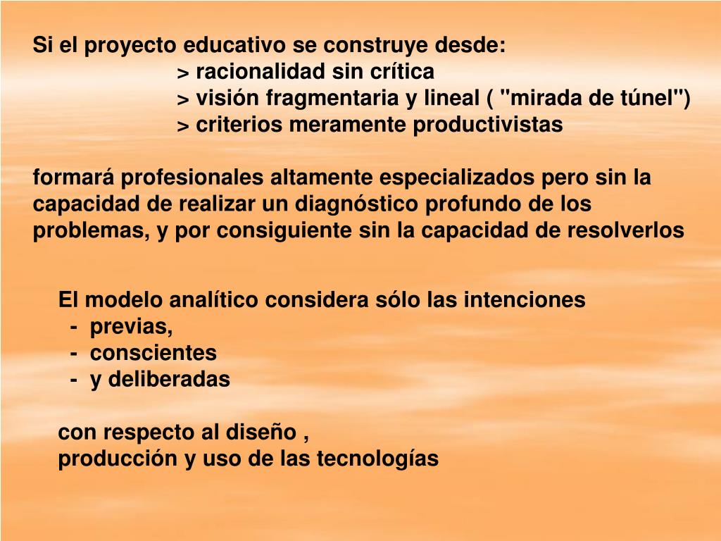 El modelo analítico considera sólo las intenciones - previas, - conscientes - y deliberadas con respecto al diseño , producción y uso de las tecnologías Si el proyecto educativo se construye desde: > racionalidad sin crítica > visión fragmentaria y lineal ( "mirada de túnel") > criterios meramente productivistas formará profesionales altamente especializados pero sin la capacidad de realizar un diagnóstico profundo de los problemas, y por consiguiente sin la capacidad de resolverlos