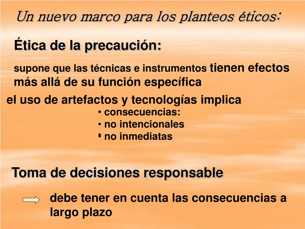 debe tener en cuenta las consecuencias a largo plazo Un nuevo marco para los planteos éticos: Ética de la precaución: supone que las técnicas e instrumentos tienen efectos más allá de su función específica el uso de artefactos y tecnologías implica • consecuencias: • no intencionales • no inmediatas Toma de decisiones responsable