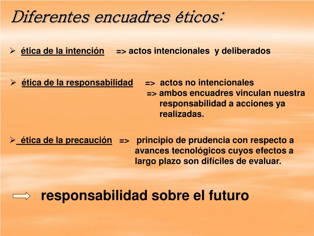 responsabilidad sobre el futuro Diferentes encuadres éticos: • ética de la intención => actos intencionales y deliberados • ética de la responsabilidad => actos no intencionales • => ambos encuadres vinculan nuestra responsabilidad a acciones ya realizadas. • ética de la precaución => principio de prudencia con respecto a avances tecnológicos cuyos efectos a largo plazo son difíciles de evaluar.