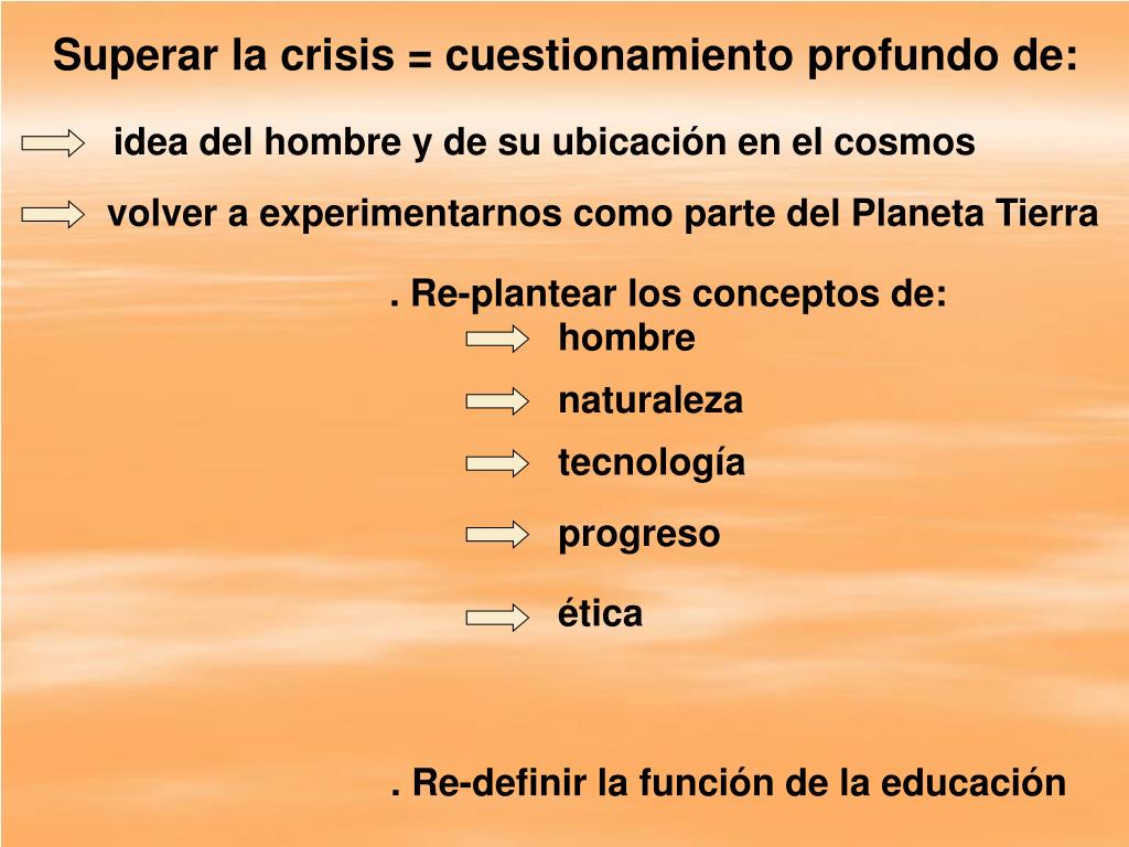 idea del hombre y de su ubicación en el cosmos volver a experimentarnos como parte del Planeta Tierra hombre naturaleza tecnología progreso ética Superar la crisis = cuestionamiento profundo de: . Re-plantear los conceptos de: . Re-definir la función de la educación