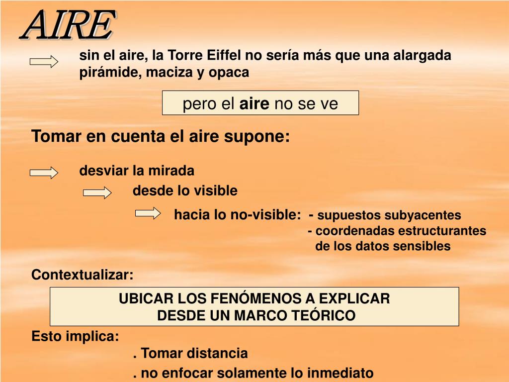 AIRE sin el aire, la Torre Eiffel no sería más que una alargada pirámide, maciza y opaca hacia lo no-visible: - supuestos subyacentes - coordenadas estructurantes de los datos sensibles desde lo visible desviar la mirada Contextualizar: UBICAR LOS FENÓMENOS A EXPLICAR DESDE UN MARCO TEÓRICO Esto implica: . Tomar distancia . no enfocar solamente lo inmediato pero el aire no se ve Tomar en cuenta el aire supone: