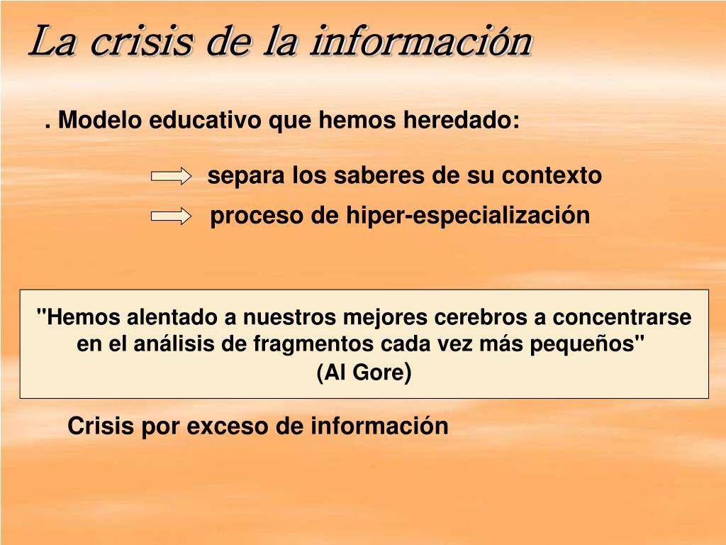 separa los saberes de su contexto proceso de hiper-especialización La crisis de la información . Modelo educativo que hemos heredado: "Hemos alentado a nuestros mejores cerebros a concentrarse en el análisis de fragmentos cada vez más pequeños" (Al Gore) Crisis por exceso de información