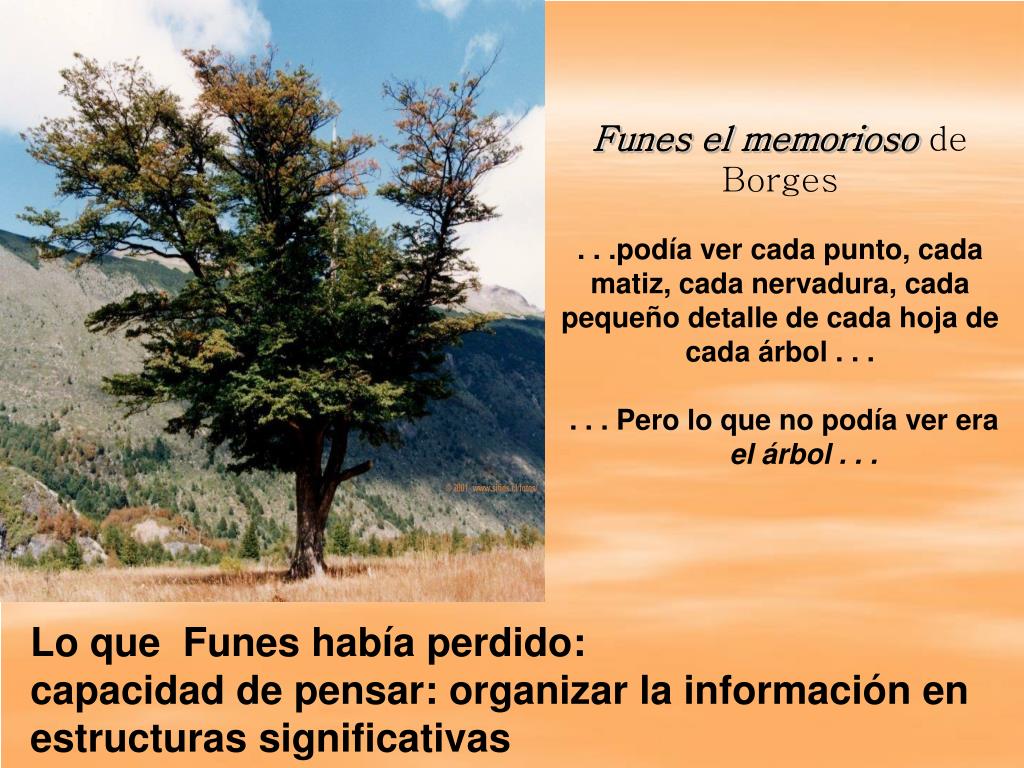 Funes el memorioso de Borges . . .podía ver cada punto, cada matiz, cada nervadura, cada pequeño detalle de cada hoja de cada árbol . . . . . . Pero lo que no podía ver era el árbol . . . Lo que Funes había perdido: capacidad de pensar: organizar la información en estructuras significativas