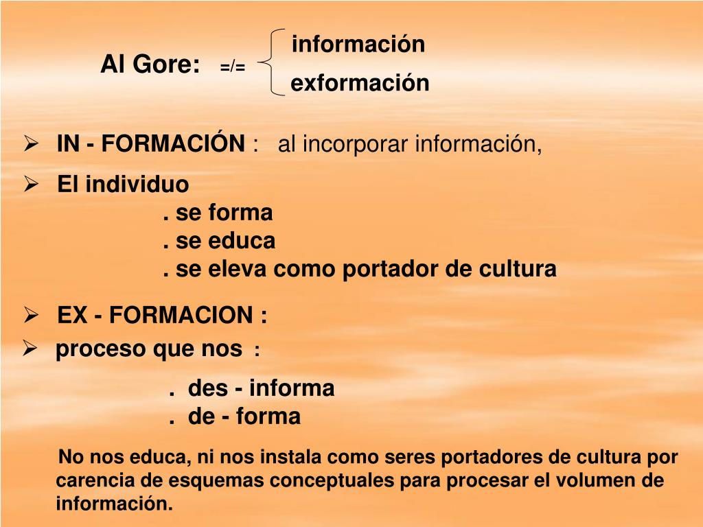 información Al Gore: =/= exformación • IN - FORMACIÓN : al incorporar información, • El individuo . se forma . se educa . se eleva como portador de cultura • EX - FORMACION : • proceso que nos : . des - informa . de - forma No nos educa, ni nos instala como seres portadores de cultura por carencia de esquemas conceptuales para procesar el volumen de información.