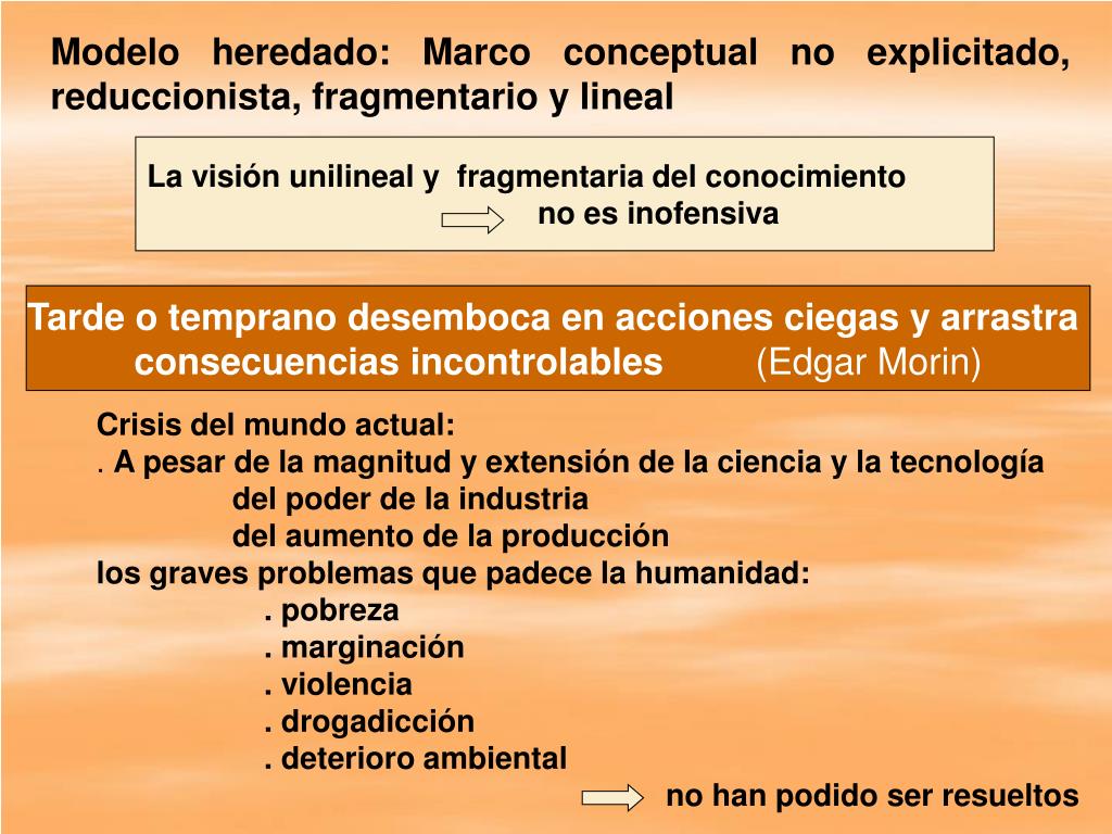 La visión unilineal y fragmentaria del conocimiento no es inofensiva Crisis del mundo actual: . A pesar de la magnitud y extensión de la ciencia y la tecnología del poder de la industria del aumento de la producción los graves problemas que padece la humanidad: . pobreza . marginación . violencia . drogadicción . deterioro ambiental no han podido ser resueltos Modelo heredado: Marco conceptual no explicitado, reduccionista, fragmentario y lineal Tarde o temprano desemboca en acciones ciegas y arrastra consecuencias incontrolables (Edgar Morin)