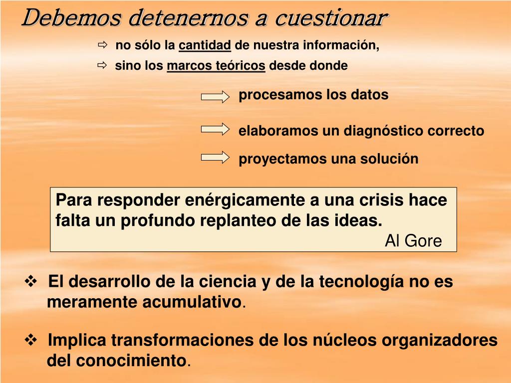 Debemos detenernos a cuestionar procesamos los datos elaboramos un diagnóstico correcto proyectamos una solución • no sólo la cantidad de nuestra información, • sino los marcos teóricos desde donde Para responder enérgicamente a una crisis hacefalta un profundo replanteo de las ideas. Al Gore • El desarrollo de la ciencia y de la tecnología no es meramente acumulativo. • Implica transformaciones de los núcleos organizadores del conocimiento.