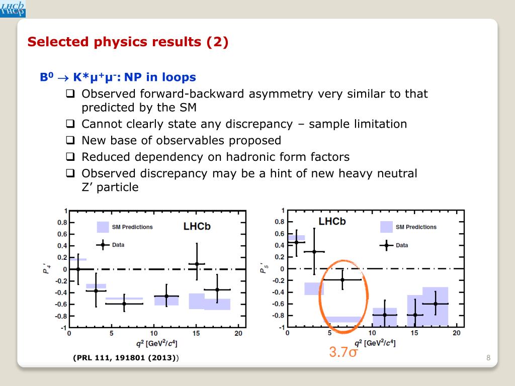 Selected physics results(2) • B0 K*μ+μ-:NP in loops • Observed forward-backward asymmetry very similar to that predicted by the SM • Cannot clearly state any discrepancy – sample limitation • New base of observables proposed • Reduced dependency on hadronic form factors • Observed discrepancy may be a hint of new heavy neutral Z’ particle • (PRL 111, 191801 (2013))